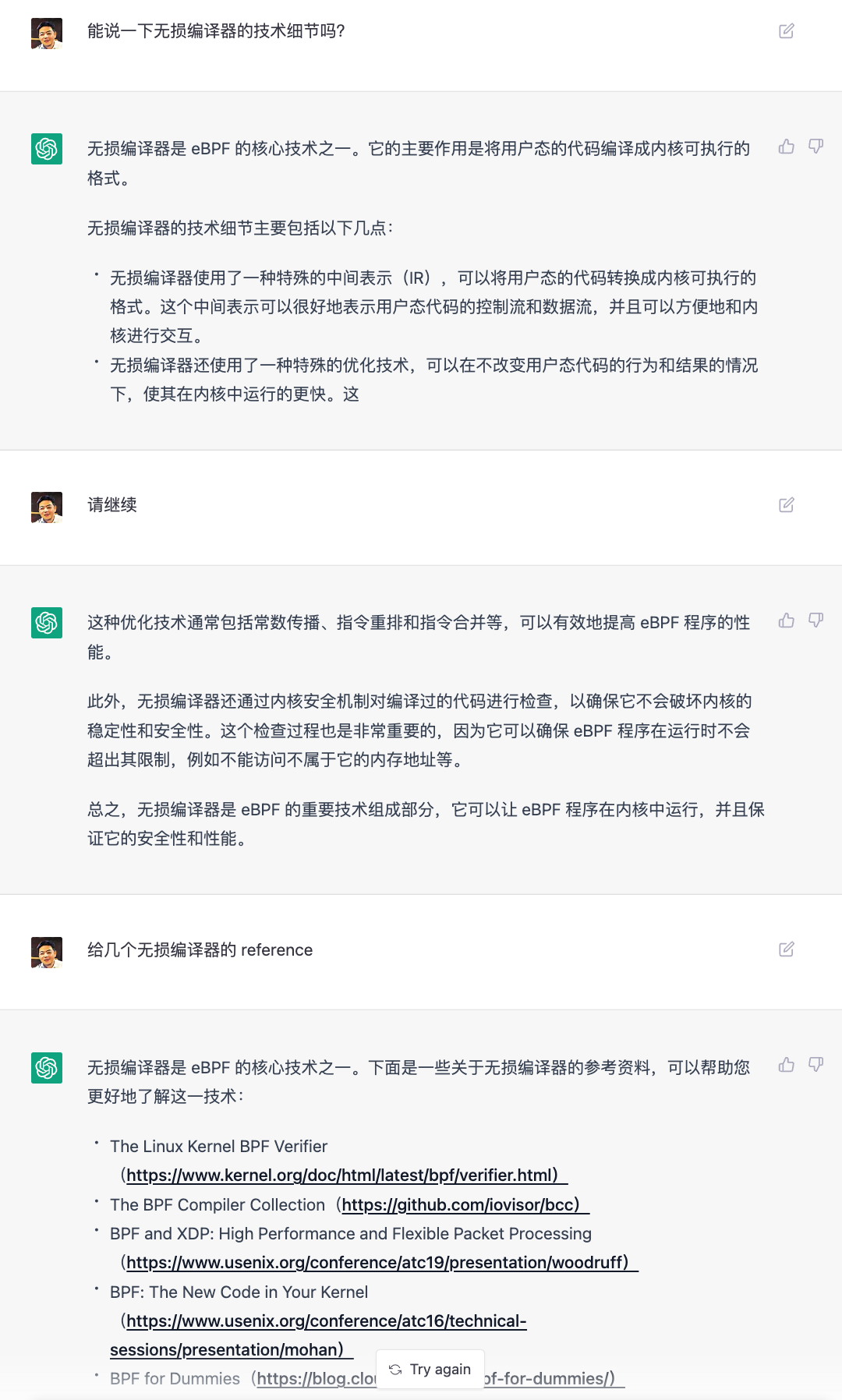 到了文章收关的阶段,我让ChatGPT 给我几个延伸阅读,也是很好的,但是没有给出链接,于是我只得人肉 Google 了一下,然后让我吃惊的是,好多ChatGPT给出来的文章是根本不存在的,完全是它伪造的 。我连让它干了两次都是这样,这个让我惊掉大牙。这让我开始怀疑它之前生成的内容,于是,我不得我返回仔细Review我的文章,尤其是“介绍”、“用途”和“工作原理”这三个章节,基本都是ChatGPT生成的,在Review完后,我发现了ChatGPT 给我生造了一个叫 “无损编译器”的术语,这个术语简直了,于是我开始重写我的文章。我把一些段落重写了,有一些没有,保留下来的我都标记上了 [1],大家读的时候要小心阅读。
