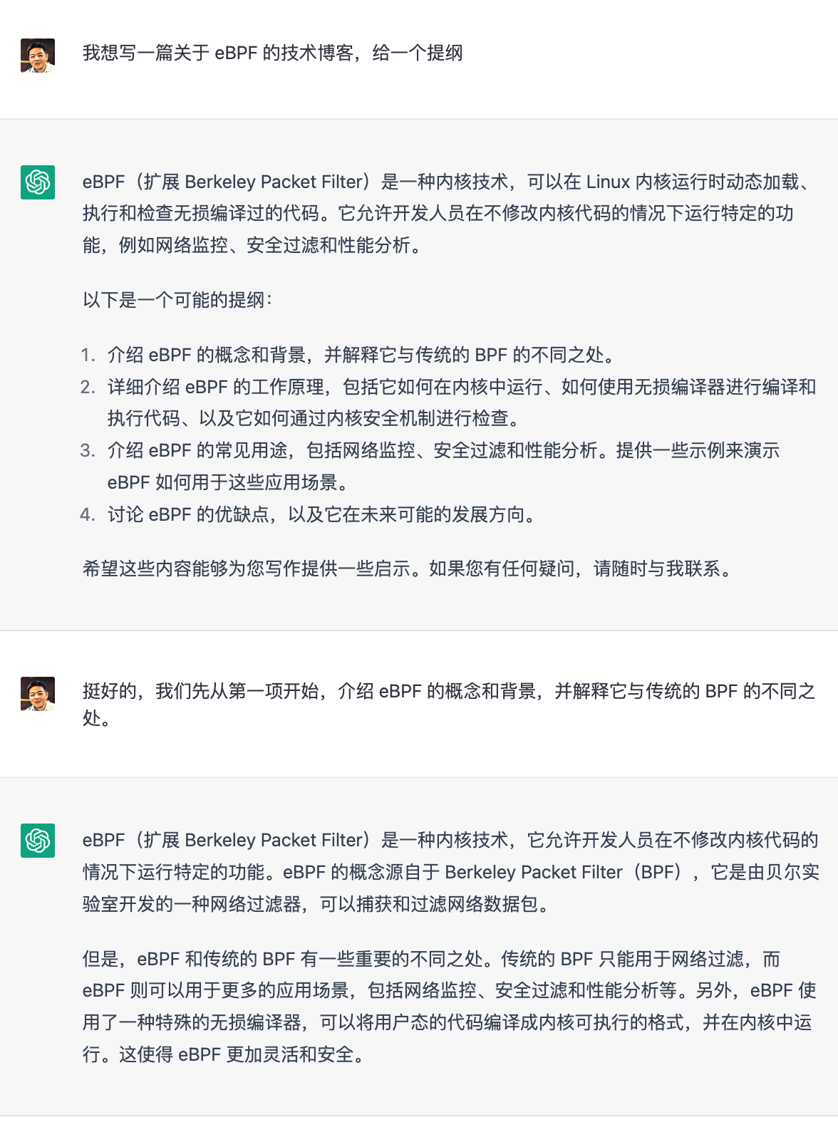 最后来到彩蛋环节。因为最近 ChatGPT 很火,于是,我想通过 ChatGPT 来帮助我书写这篇文章,一开始我让ChatGPT 帮我列提纲,并根据提纲生成文章内容,并查找相关的资料,非常之顺利,包括生成的代码,我以为我们以很快地完成这篇文章。